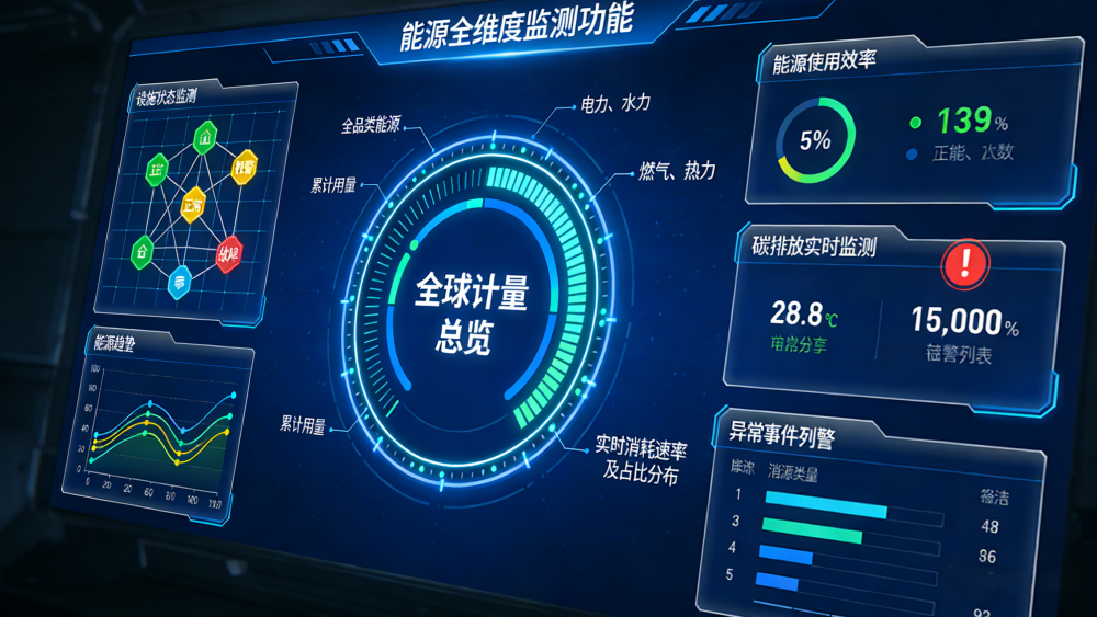 全品类能源计量监测:实时采集电水气暖、绿电等产耗存数据,支持多维度精细化秒级计量。